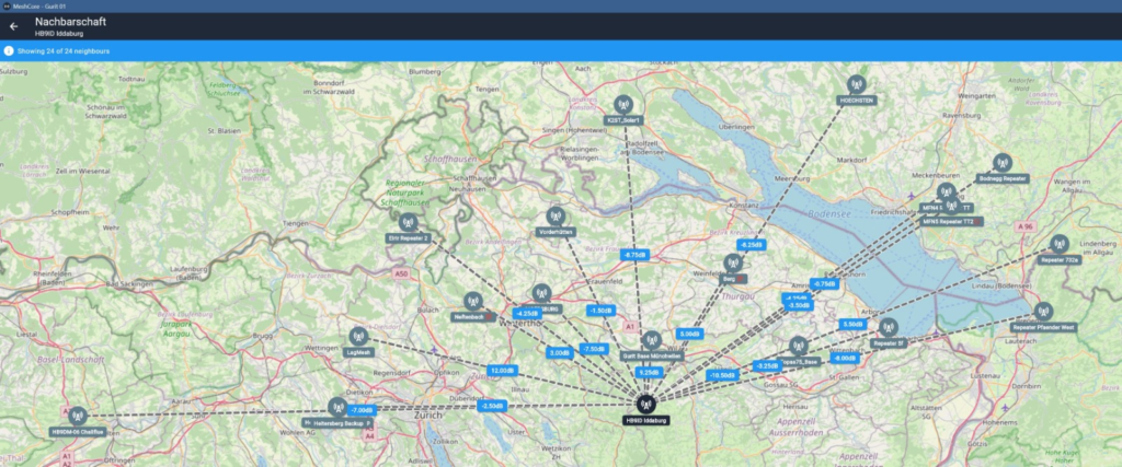 MeshCore ist ein Funkprotokoll für verschlüsselte textbasierte Kommunikation unter Verwendung von LoRa-Funkhardware. In der Schweiz und in Europa nutzt MeshCore die Frequenz 869.618 MHz. MeshCore hat partielle Ähnlichkeiten zu Meshtastic verfolgt aber mit dedizierten Repeatern andere konzeptionelle Ansätze bei der Netzstruktur. Die effiziente Multi-Hop-Routing Fähigkeit des Protokolls ermöglicht es verhältnismässig weitläufige Netze mit bis zu 64 Hops zu realisieren. Genua bis Stuttgart ist ab der Iddaburg möglich. https://www.meshcore.ch/map/